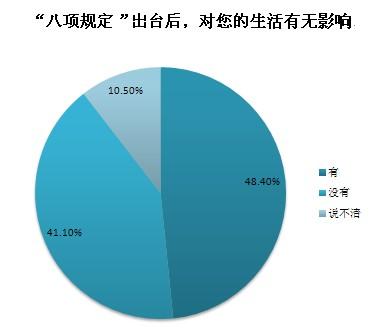 截至2013年12月20日10時(shí),共收到網(wǎng)絡(luò)問卷2442份,48.4%的受訪者認(rèn)為“八項(xiàng)規(guī)定”對(duì)個(gè)人生活有影響,其中公務(wù)員群體認(rèn)為“八項(xiàng)規(guī)定”帶來的最大影響是“公務(wù)吃請(qǐng)少了,能抽出更多時(shí)間陪伴家人”和“津貼補(bǔ)貼獎(jiǎng)金少了,勒緊褲帶過日子”,非公務(wù)員群體認(rèn)為“八項(xiàng)規(guī)定”帶來的最大影響是“酒店、高端會(huì)所門外的公務(wù)用車少了”和“遇到領(lǐng)導(dǎo)考察工作時(shí),地毯鮮花迎送領(lǐng)導(dǎo)的情況少了”。