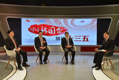 江西省國資委主任、黨委副書記陳德勤(右二),江西省國資委副主任、黨委委員鄭高清(左一),全國人大代表,江西銅業(yè)股份有限公司董事長、黨委書記李保民(左2),與特邀訪談主持人、國家行政學(xué)院研究員張春曉(右一)在人民網(wǎng)演播室交流
