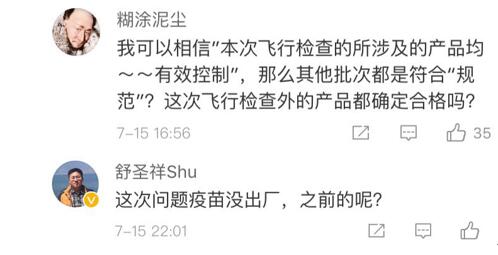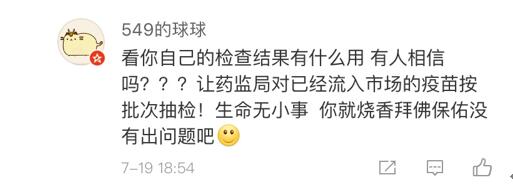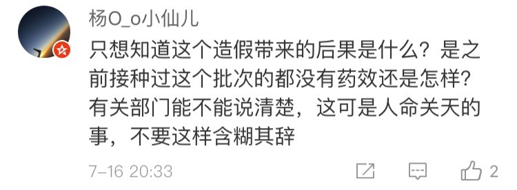 網(wǎng)友“楊O_o小仙兒”表示:“只想知道這個造假帶來的后果是什么?是之前接種過這個批次的都沒有藥效還是怎樣?有關部門能不能說清楚,這可是人命關天的事,不要這樣含糊其辭。”
