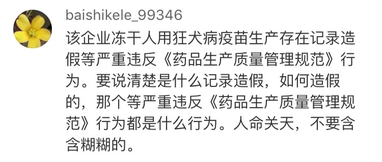 網(wǎng)友“baishikele_99346”認為:“要說清楚是什么記錄造假,如何造假的,那個等嚴重違反《藥品生產(chǎn)質量管理規(guī)范》行為的都是什么行為。人命關天,不要含含糊糊!