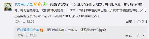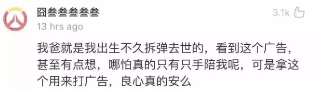 @囧叁叁叁叁叁:我爸就是我出生不久拆彈去世的,看到這個(gè)廣告,甚至有點(diǎn)想,哪怕真的只有只手陪我呢,可是拿這個(gè)來打廣告,良心真的安么?
