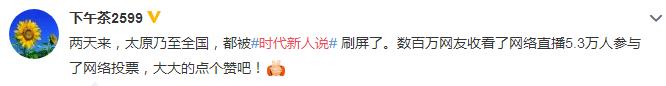 #時(shí)代新人說#微博話題下不乏這樣的留言:“太原乃至全國,都被‘時(shí)代新人說’刷屏了”、“雖不是太原人,也刷著直播頁面,被時(shí)代新人說的力量感染著”。