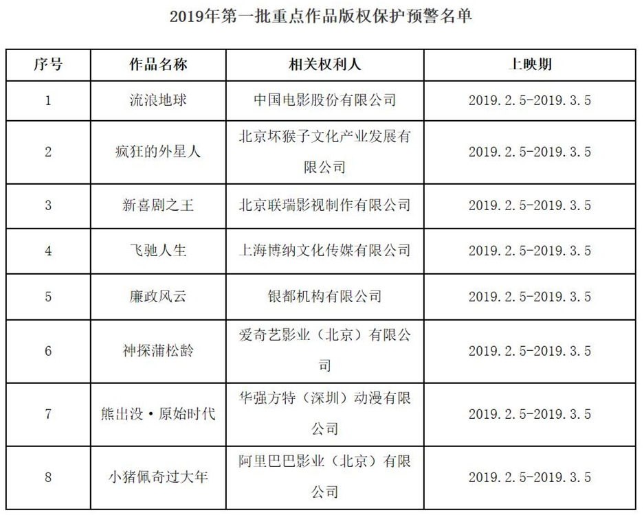 2019年度第一批重點作品版權保護預警名單,《流浪地球》等賀歲片在列。(國家版權局)