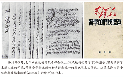 延安整風運動以反對主觀主義、宗派主義、黨八股,樹立馬克思主義作風為主要內(nèi)容。而鑒于深重的思想之弊和慘痛的實踐教訓,反對主觀主義以整頓學風,成為開展整風運動的關(guān)鍵。整風運動開展后,毛澤東就緊緊抓住思想方法和作風問題不放。他在給中央研究組同志的信中指出:學習理論要“以研究思想方法論為主”。破除錯誤的思想方法,暢行正確的思想作風,最重要的就是要遵循實事求是的思想路線,做到理論聯(lián)系實際!皩嵤虑笫恰边@個詞,并非毛澤東首創(chuàng),但把“實事求是”上升到黨的思想路線的高度,則是毛澤東的功勞。毛澤東強調(diào),“要分清創(chuàng)造性的馬克思主義和教條式的馬克思主義”,“宣傳創(chuàng)造性的馬克思主義”,“使中國革命豐富的實際馬克思主義化”。不能從理論上來思考中國革命實踐的人,是不能妄稱為馬克思主義理論家的。只有從客觀實際中概括出而又在客觀實際中得到證明的理論,才稱得起我們所講的理論。
