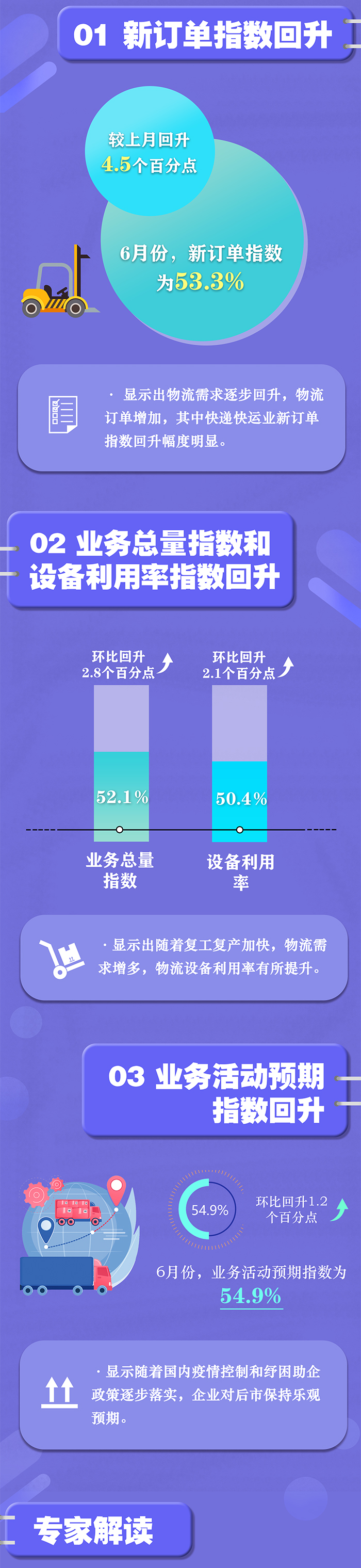 物流被稱作是國(guó)民經(jīng)濟(jì)的“晴雨表”。中國(guó)物流與采購聯(lián)合會(huì)會(huì)長(zhǎng)助理、高級(jí)經(jīng)濟(jì)師何輝在接受人民網(wǎng)“強(qiáng)觀察”欄目記者采訪時(shí)表示,從物流業(yè)景氣指數(shù)等數(shù)據(jù)看,隨著國(guó)內(nèi)疫情防控形勢(shì)好轉(zhuǎn)和穩(wěn)經(jīng)濟(jì)系列政策持續(xù)發(fā)力,6月份國(guó)內(nèi)市場(chǎng)供應(yīng)鏈上下游業(yè)務(wù)活動(dòng)進(jìn)一步恢復(fù),并逐步趨于活躍。