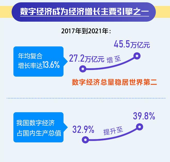 《報告》顯示,2017年到2021年,我國數(shù)字經(jīng)濟規(guī)模從27.2萬億增至45.5萬億元,總量穩(wěn)居世界第二,年均復(fù)合增長率達(dá)13.6%,占國內(nèi)生產(chǎn)總值比重從32.9%提升至39.8%,成為推動經(jīng)濟增長的主要引擎之一。