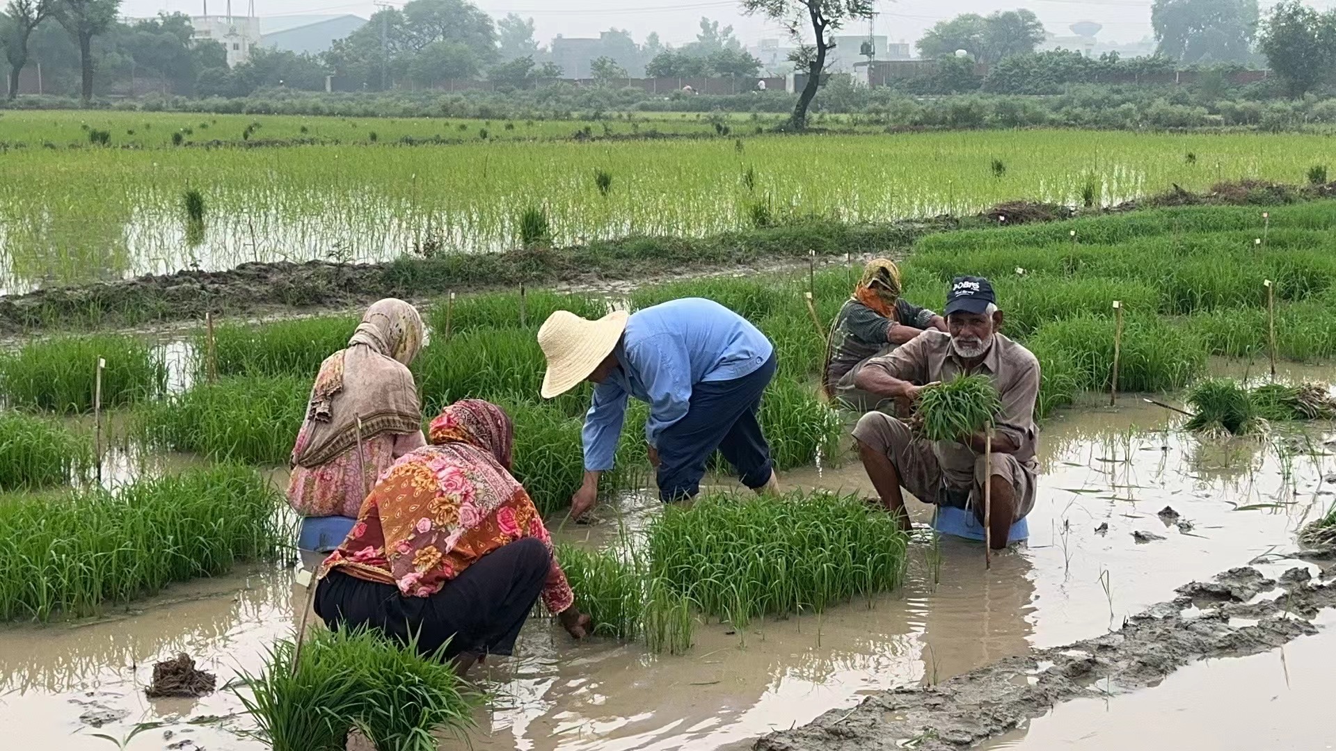 位于巴基斯坦東部旁遮普省首府拉合爾的雜交水稻育種站田里,龍春久頭戴黃草帽、身穿工作服、褲腳挽至膝蓋,赤足站在泥濘的水田里,彎著腰指導當地農民們拔苗插秧,汗水如雨水般從他黝黑的面龐上淌下。
